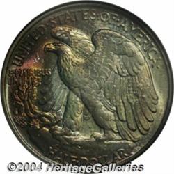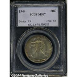 <B>1944<50C> MS67 PCGS.</B></I> This coin's technical perfection, fullness of strike, and bright mint luster is easy to overlook because of the extraordinary, deep olive-green, rose, and golden toning that covers each side. Population: 37 in 67, 0 finer (3/04).<BR><I>From The Del Rio Collection, Part One.</B></I> <BR><BR><B>Important notice:</B> Heritage usually auctions material at the rate of 200-250 lots per hour. On some occasions eBay Live bid software or the Internet may not be able to keep up with the pace of the auction. We recommend placing a realistic absentee bid now as insurance to avoid disappointment. Occasionally the auctioneer may eliminate or reject an eBay Live bid, and the auctioneer may also reopen a lot after the close of the eBay live bidding (usually because we missed an audience bid), and may reject your bid even if it shows you as the winning bidder. By bidding via eBay Live, you agree that Heritage may award the lot to another bidder at its sole discretion under the circumstances described above or any other reasonable circumstances. Since eBay bids are not shown to us until we open the lot on the floor, we treat those bids just like floor bids. In most cases the floor responds before the eBay bid is presented to us, due to Internet lag time, so for consistency we have made it a policy that floor bids are always considered first over tie eBay live bids. Also please note that all Heritage lots purchased through eBay Live carry a 20% Buyer's Premium. Please make sure you read the Terms and Conditions before you bid. </span></font></tr></table></td></tr></table>
