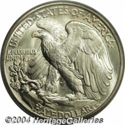 <B>1944<50C> MS67 PCGS.</B></I> Full white luster with a nice, but not quite full strike and few imperfections. Much rarer in this Superb condition than one might expect with a total of only 40 coins certified in MS 67 by PCGS, with none finer (7/04). <BR><BR><B>Important notice:</B> Heritage usually auctions material at the rate of 200-250 lots per hour. On some occasions eBay Live bid software or the Internet may not be able to keep up with the pace of the auction. We recommend placing a realistic absentee bid now as insurance to avoid disappointment. Occasionally the auctioneer may eliminate or reject an eBay Live bid, and the auctioneer may also reopen a lot after the close of the eBay live bidding (usually because we missed an audience bid), and may reject your bid even if it shows you as the winning bidder. By bidding via eBay Live, you agree that Heritage may award the lot to another bidder at its sole discretion under the circumstances described above or any other reasonable circumstances. Since eBay bids are not shown to us until we open the lot on the floor, we treat those bids just like floor bids. In most cases the floor responds before the eBay bid is presented to us, due to Internet lag time, so for consistency we have made it a policy that floor bids are always considered first over tie eBay live bids. Also please note that all Heritage lots purchased through eBay Live carry a 20% Buyer's Premium. Please make sure you read the Terms and Conditions before you bid. </span></font></tr></table></td></tr></table>