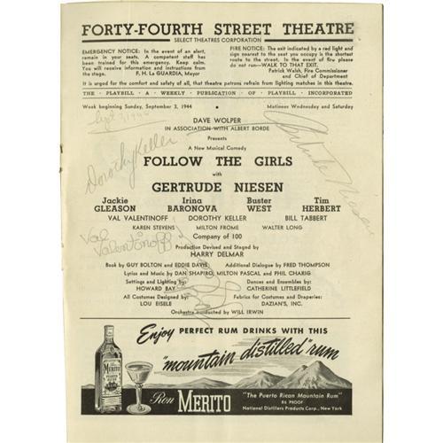 <B>1944 Broadway Playbill Signed by Jackie Gleason,</B></I> Gertrude Niesen, Dorothy Keller, and Val Valentinoff for <I>Follow the Girls.</B></I> It was September 7, 1944 in New York City. Fiorello LaGuardia was mayor. The war was dragging on and a young Brooklyn-born Jackie Gleason was getting his first big break on Broadway playing "Goofy Gale" in a musical comedy starring singer Gertrude Niesen titled <I>Follow the Girls.</B></I> That evening some patient theatregoer waited by the stage door at the Forty-Fourth Street Theatre and got four of the actors' autographs in pencil on the title page inside their issue of Playbill. That very issue is offered here and it is almost certainly one of the earliest Jackie Gleason autographs ever offered. The Playbill is 6.5" x 9" and is in very fine condition.