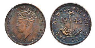 1944-C. PCGS graded Mint State-64. Brown. Iridescent bloom under even brown fields. A rare Newfoundland coin.
