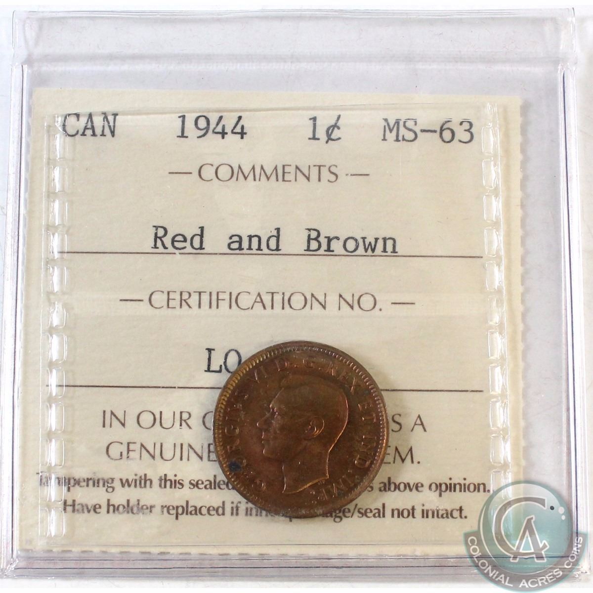 1944 Canada 1-cent ICCS Certified MS-63 Red and Brown