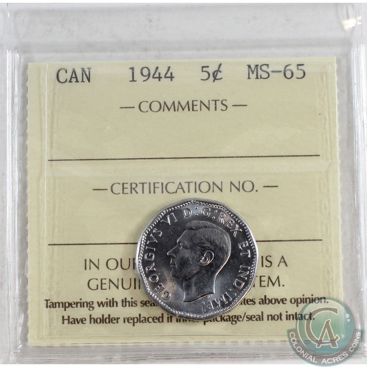 1944 Canada 5-cent ICCS Certified MS-65