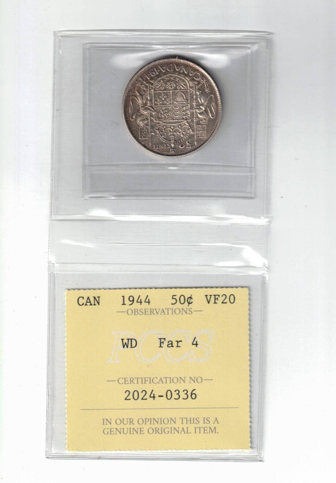 1944 Canada 50¢; WD Far 4, Certified PCCS VF20, Professional Coin Certification System