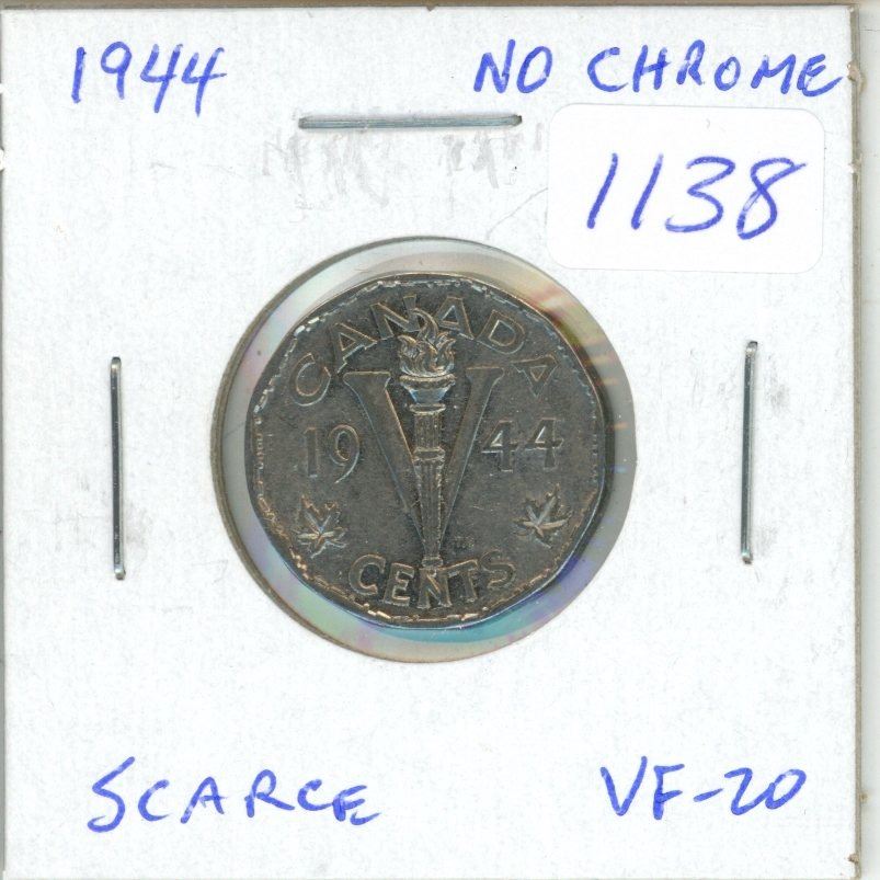 1944 Canadian 5 Cents with No Chrome. This one missed the chromium plating. VF-20. Scarce.