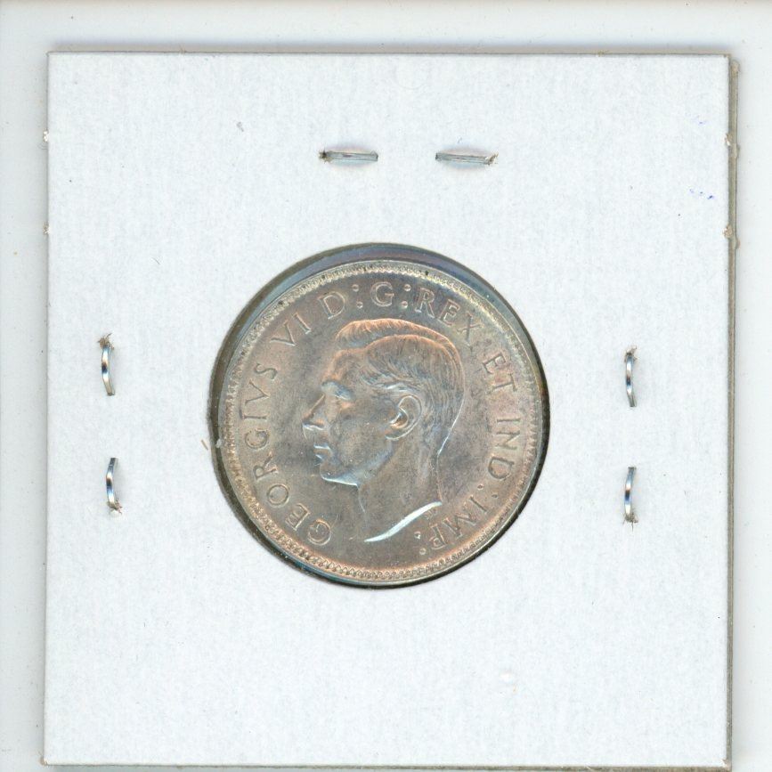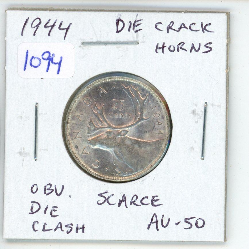 1944 Canadian Silver 25 Cents. Obverse Die Clash visible in front of and behind the king’s head as well as Die Crack through the Caribou’s Horns. AU-50. Scarce.