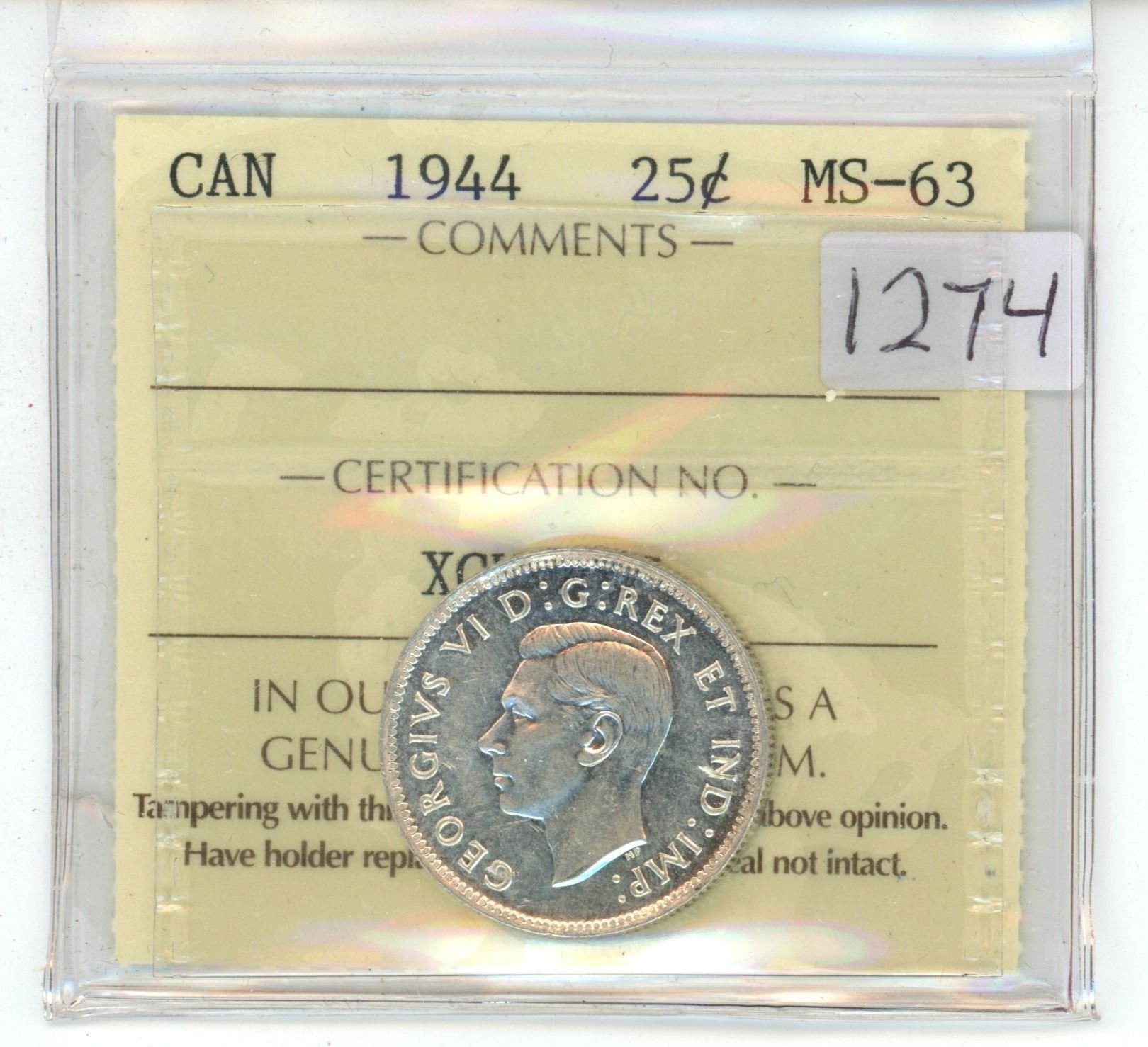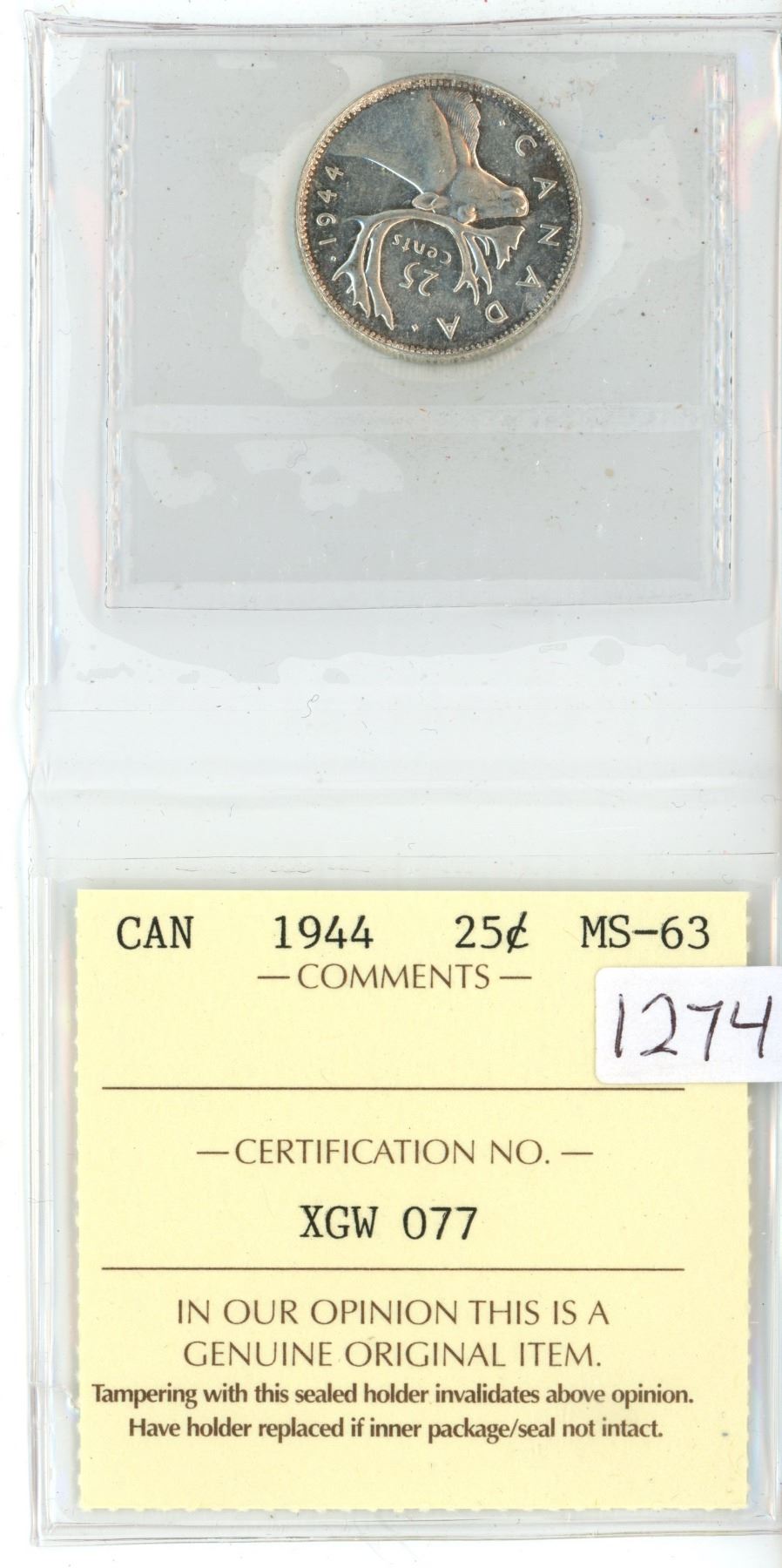 1944 Canadian graded silver, 25 cent coin - ICCS - MS63