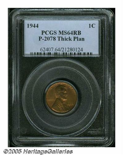 <B>1944 Cent, Pollock-2078, R.7?, MS 64 Red and Brown PCGS.</B></I> Struck from the regular dies of 1944, but on thicker planchet stock. Struck from bronze or some similar copper composition with a plain edge. Listed as 'experimental cents' in the Seventh Edition of the Judd pattern reference, page 223. Some numismatists believe the variety to be a mint error, "the planchets cut from sheets of rolled stock intended for the production of foreign coins" according to Pollock. A lustrous, clean, and bold near-Gem, the orange color faded to medium brown hues across the portrait and the exposed fields.
