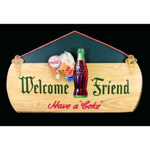 1944 Coca Cola Embossed Die Cut Cardboard Sign, Welcome Friend string hanger with Sprite Boy. Framed under glass, excellent original condition. 30 X 14 inches.