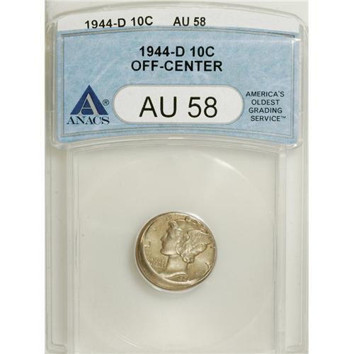 <B>1944-D 10C --Off-Center--AU58 ANACS.</B></I> NGC Census: (12/1404). PCGS Population (33/733). Mintage: 62,224,000. Numismedia Wsl. Price for NGC/PCGS coin in AU58: $4. (#5052)<BR><BR><b>Shipping:</b> Coins & Currency (<a target="_blank" href="http://www.heritageauctions.com/common/shipping.php">view shipping information</a>)