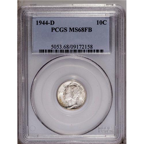 <B>1944-D<10C> MS68 Full Bands PCGS.</B></I> Lemon blushes adorn the margins, along with an occasional russet or jade-green freckle. This undisturbed Superb Gem has razor-sharp centers and only a hint of peripheral striking weakness. Population: 66 in 68, 0 finer (2/06).