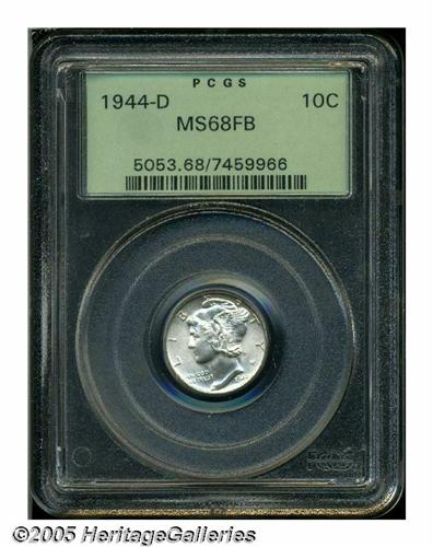 <B>1944-D<10C> MS68 Full Bands PCGS.</B></I> Lustrous surfaces display some grayish and golden-brown speckles at the borders. The design features are well struck, and there are no mentionable marks. Population: 61 in 68 Full Bands, 0 finer (5/05). <BR><I>From The Western Hills Collection.</B></I>