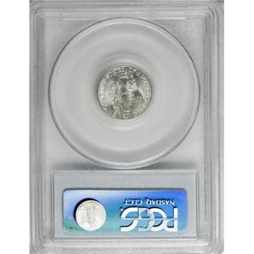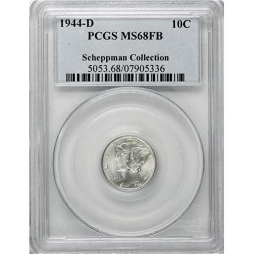 <B>1944-D 10C MS68 Full Bands PCGS.</B></I> This seemingly immaculate D-mint survivor offers magnificent visual appeal that comes from vibrant luster, pleasing silver-white and light blue patina, and excellent definition. Neither NGC nor PCGS has graded a finer Full Bands coin (12/07).<BR><I>From The Scheppman Collection, #4 PCGS Registry of Full Band Mercury Dimes.</B></I><BR><BR><B>Coin Engraver:</B> Adolph A. Weinman<BR><BR><b>Shipping:</b> Coins & Currency (<a target="_blank" href="http://www.heritageauctions.com/common/shipping.php">view shipping information</a>)