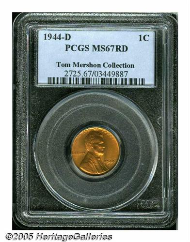 <B>1944-D<1C> MS67 Red PCGS.</B></I> Sharply struck and highly lustrous, this impeccable Superb Gem displays unusually vivid red-orange coloration, and is nearly carbon-free. A technically and visually impressive Lincoln cent. Just one example has been rated higher, by PCGS (3/05).<BR><I>From The Tom Mershon #2 All-Time PCGS Registry Set of Lincoln Wheat Cents.</B></I>