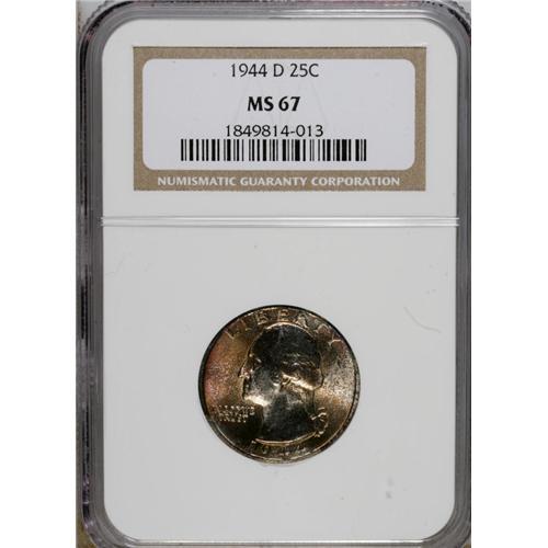 1944-D 25C MS67 NGC. Cherry-red, almond-gold, and slat