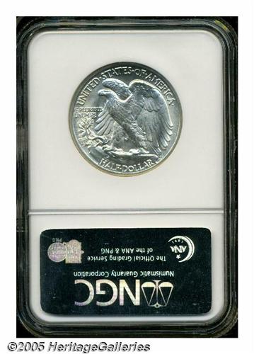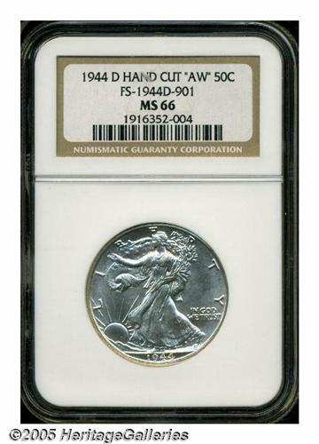 <B>1944-D<50C> Hand Engraved AW MS66 NGC.</B></I> FS-1944D-901. A lovely example of this unusual and elusive variety with fully lustrous silver surfaces. Apparently a single die had the designer's initials hand engraved into the die, presumably because the monogram was inadvertently removed when the die was polished to remove clashmarks.