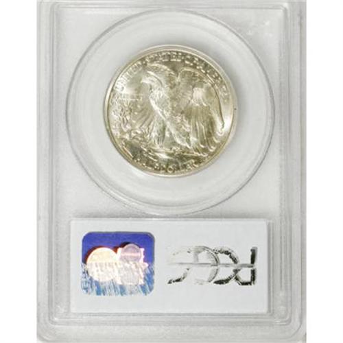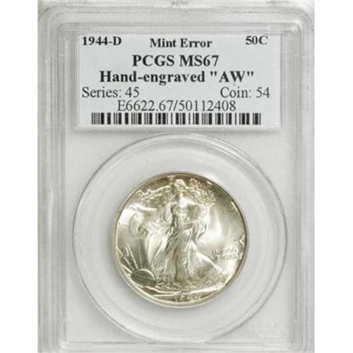 <B>1944-D 50C Hand-Engraved AW MS67 PCGS.</B></I> FS-901. Light honey-gold patina graces the borders of this highly lustrous and beautifully preserved Superb Gem. The strike is crisp, though not needle-sharp. This coin was struck from a working die that had a hand cut AW designer's monogram. Apparently, the normally incuse monogram was lapped from the working die, and a mint worker engraved a new, crude monogram on the working die instead of scrapping the die or striking pieces from it without a monogram.<BR><BR><B>Coin Engraver:</B> Adolph A. Weinman<BR><BR><b>Shipping:</b> Coins & Currency (<a target="_blank" href="http://www.heritageauctions.com/common/shipping.php">view shipping information</a>)