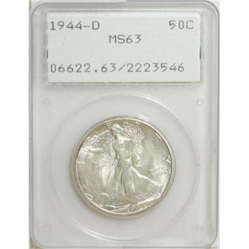 <B>1944-D 50C MS63 PCGS.</B></I> PCGS Population (629/7039). NGC Census: (213/4300). Mintage: 9,769,000. Numismedia Wsl. Price: $54. (#6622)<BR><BR><B>Coin Engraver:</B> Adolph A. Weinman<BR><BR><b>Shipping:</b> Coin/Currency (<a target="_blank" href="http://www.heritageauctions.com/common/shipping.php">view shipping information</a>\)