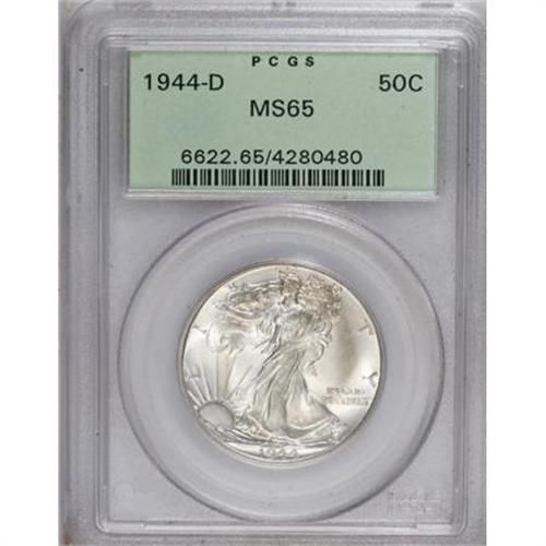 <B>1944-D 50C MS65 PCGS.</B></I> PCGS Population (3364/1577). NGC Census: (1940/1326). Mintage: 9,769,000. Numismedia Wsl. Price for NGC/PCGS coin in MS65: $175. (#6622)<BR><BR><B>Coin Engraver:</B> Adolph A. Weinman<BR><BR><b>Shipping:</b> Coins & Currency (<a target="_blank" href="http://www.heritageauctions.com/common/shipping.php">view shipping information</a>)