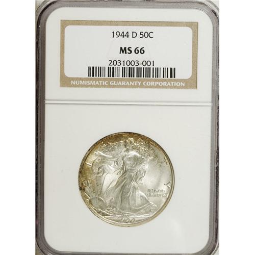 <B>1944-D 50C MS66 NGC.</B></I> NGC Census: (1130/170). PCGS Population (1374/151). Mintage: 9,769,000. Numismedia Wsl. Price: $220. (#6622)<BR><BR><b>Shipping:</b> Coins & Currency (<a target="_blank" href="http://www.heritageauctions.com/common/shipping.php">view shipping information</a>)