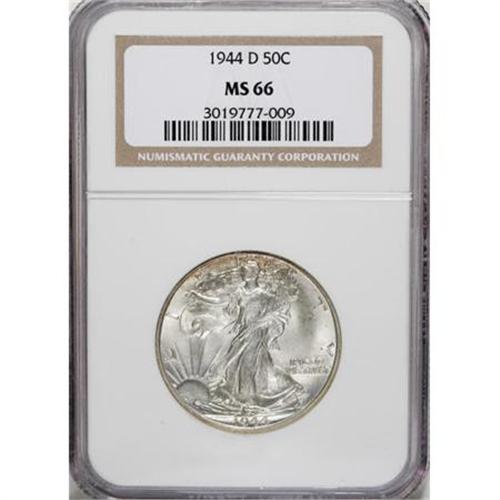 <B>1944-D 50C MS66 NGC.</B></I> NGC Census: (1151/173). PCGS Population (1411/154). Mintage: 9,769,000. Numismedia Wsl. Price for NGC/PCGS coin in MS66: $200. (#6622)<BR><BR><B>Coin Engraver:</B> Adolph A. Weinman<BR><BR><b>Shipping:</b> Coins & Currency (<a target="_blank" href="http://www.heritageauctions.com/common/shipping.php">view shipping information</a>)