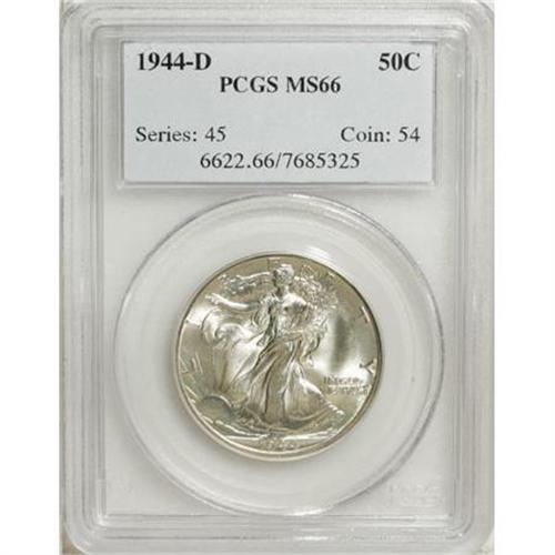 <B>1944-D 50C MS66 PCGS.</B></I> PCGS Population (1398/153). NGC Census: (1148/173). Mintage: 9,769,000. Numismedia Wsl. Price for NGC/PCGS coin in MS66: $200. (#6622)<BR><BR><B>Coin Engraver:</B> Adolph A. Weinman<BR><BR><b>Shipping:</b> Coins & Currency (<a target="_blank" href="http://www.heritageauctions.com/common/shipping.php">view shipping information</a>\)