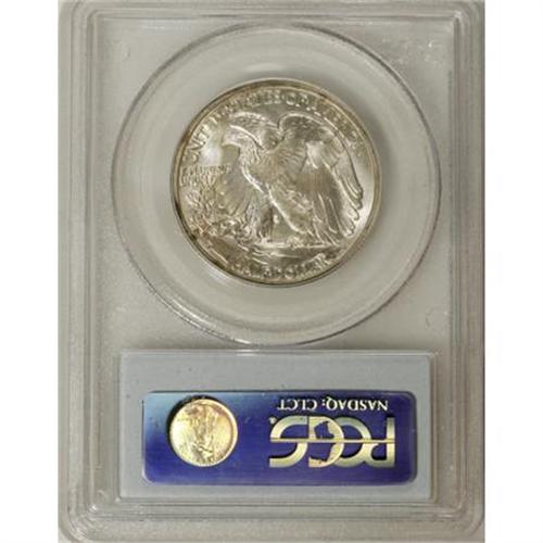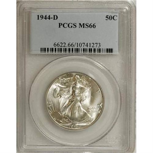 <B>1944-D 50C MS66 PCGS.</B></I> PCGS Population (1407/154). NGC Census: (1148/173). Mintage: 9,769,000. Numismedia Wsl. Price for NGC/PCGS coin in MS66: $200. (#6622)<BR><BR><B>Coin Engraver:</B> Adolph A. Weinman<BR><BR><b>Shipping:</b> Coins & Currency (<a target="_blank" href="http://www.heritageauctions.com/common/shipping.php">view shipping information</a>)