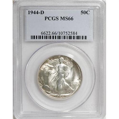 <B>1944-D 50C MS66 PCGS.</B></I> PCGS Population (1445/156). NGC Census: (1174/175). Mintage: 9,769,000. Numismedia Wsl. Price for NGC/PCGS coin in MS66: $200. (#6622)<BR><BR><B>Coin Engraver:</B> Adolph A. Weinman<BR><BR><b>Shipping:</b> Coins & Currency (<a target="_blank" href="http://www.heritageauctions.com/common/shipping.php">view shipping information</a>)
