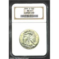 1944-D 50C MS67 NGC. The borders have light yellow color, with a small toning spot on the eagle's front wing. Well struck except for the branch hand. A lustrous and exquisitely preserved Superb Gem. Important notice: We expect to be auctioning lots at the rate of 200-250 per hour. Sometimes eBay Premier live bid software cannot keep up with that pace, so we strongly recommend that you place a realistic proxy bid now as insurance to avoid disappointment. Also please note that all Heritage/CAA lots purchased through eBay Premier carry a 20% Buyer's Premium. Please make sure you read the Terms and Conditions.