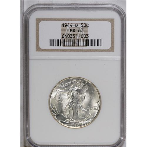 <B>1944-D 50C MS67 NGC.</B></I> A remarkable Superb Gem that has subtle rose and powder-blue accents on the otherwise untoned surfaces. Well struck and appealing, this piece is tied for the finest certified by NGC (8/06).<BR><I>From The Dr. Robert J. Loewinger Collection.</B></I><BR><BR><b>Shipping:</b> Coin/Currency (<a target="_blank" href="http://www.heritageauctions.com/common/shipping.php">view shipping information</a>) <BR><BR><B>Important