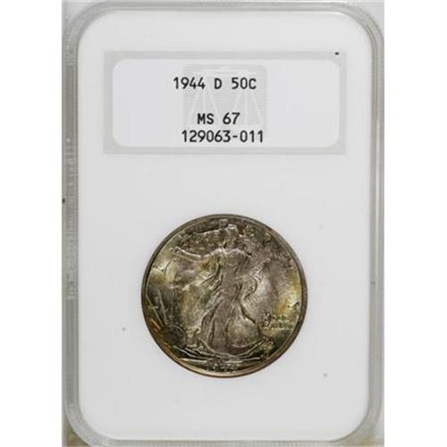 <B>1944-D 50C MS67 NGC.</B></I> Crisply struck with vibrant luster and remarkable eye appeal. Green-gold and silver-blue shadings converge on each side of this Superb Gem, which is housed in a prior-generation NGC holder.<BR><BR><B>Coin Engraver:</B> Adolph A. Weinman<BR><BR><b>Shipping:</b> Coins & Currency (<a target="_blank" href="http://www.heritageauctions.com/common/shipping.php">view shipping information</a>)