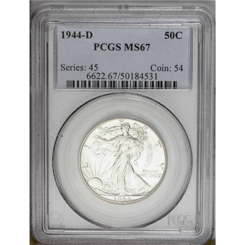 1944-D 50C MS67 PCGS. The luster is deep and frosty on 1944-D[50C] MS67 PCGS.