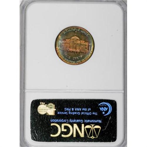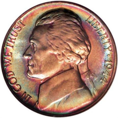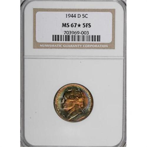 <B>1944-D 5C MS67 </B></I> S<B> 5 Full Steps NGC.</B></I> This is one of just four 1944-D 5 Full Steps War nickels that have been assigned the coveted Star designation by NGC. Golden-tan patina in the centers transitions to concentric circles of lavender, violet, cobalt-blue, and crimson-gold, and a powerful strike leaves excellent definition on all of the design elements, culminating in five (technically 5 3/4) full steps. Impeccably preserved. Simply outstanding technical quality and aesthetic appeal!<BR><BR><b>Shipping:</b> Coins & Currency (<a target="_blank" href="http://www.heritageauctions.com/common/shipping.php">view shipping information</a>)