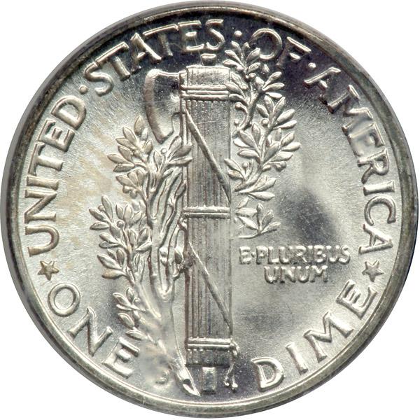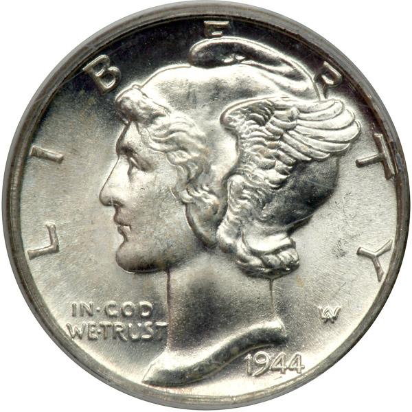 1944-D Mercury Dime. PCGS graded MS-68 Full Bands. A superb santiny mint gem. In an old green label holder. Pop 78 (PCGS # 5053) .