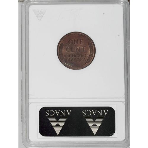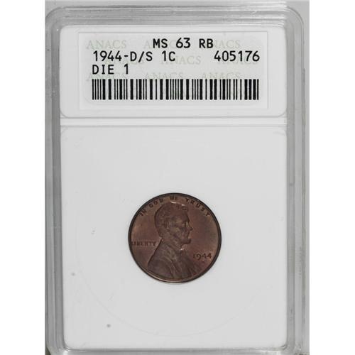<B>1944-D/S<1C> MS63 Red and Brown ANACS.</B></I> OMM-1, FS-020. A satiny brick-red example that has hints of aqua and lilac on the lower left reverse. Sharply struck and satiny with only minor abrasions.