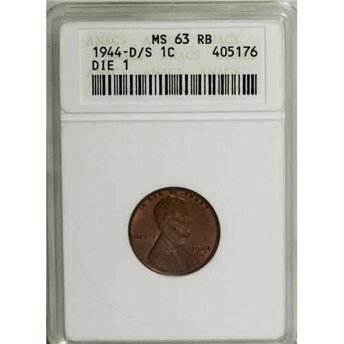<B>1944-D/S 1C MS63 Red and Brown ANACS.</B></I> OMM-1 (the most prominent variety), FS-020. A satiny brick-red example that has hints of aqua and lilac on the lower left reverse. Sharply struck and satiny with only minor abrasions.<BR><BR><b>Shipping:</b> Coin/Currency (<a target="_blank" href="http://www.heritageauctions.com/common/shipping.php">view shipping information</a>)