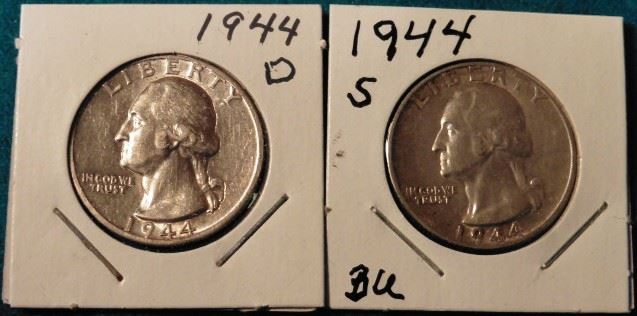 1944 D & S Washington Quarters. AU-BU. Red Book value $20-40.00.