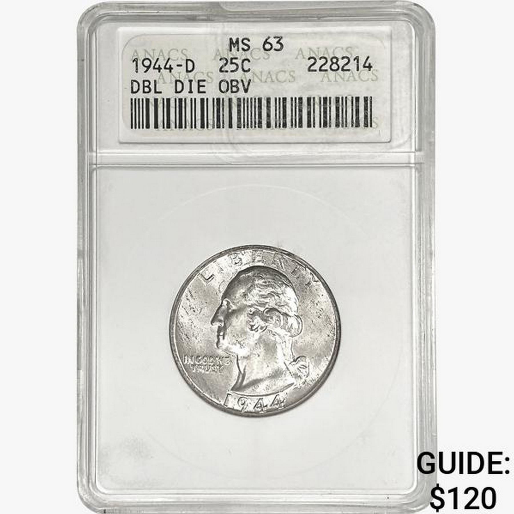 1944-D Washington SILV 25C ANACS MS63 DBL DIE OBV