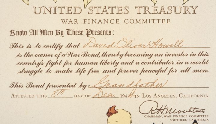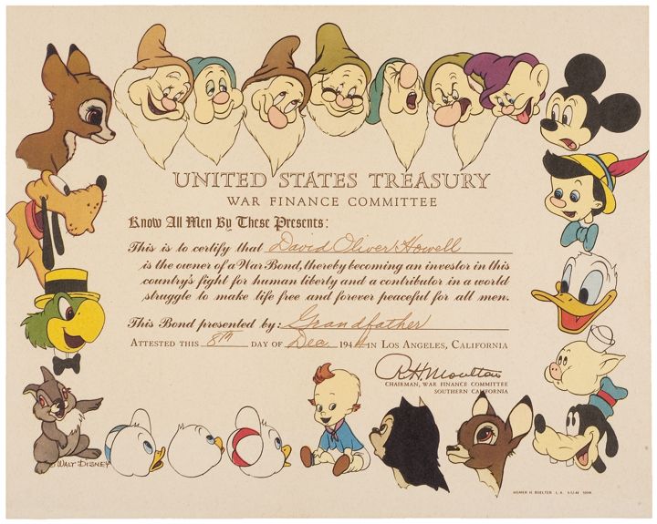 1944 Disney, WW II Bond United States Treasury Certificate of Appreciation