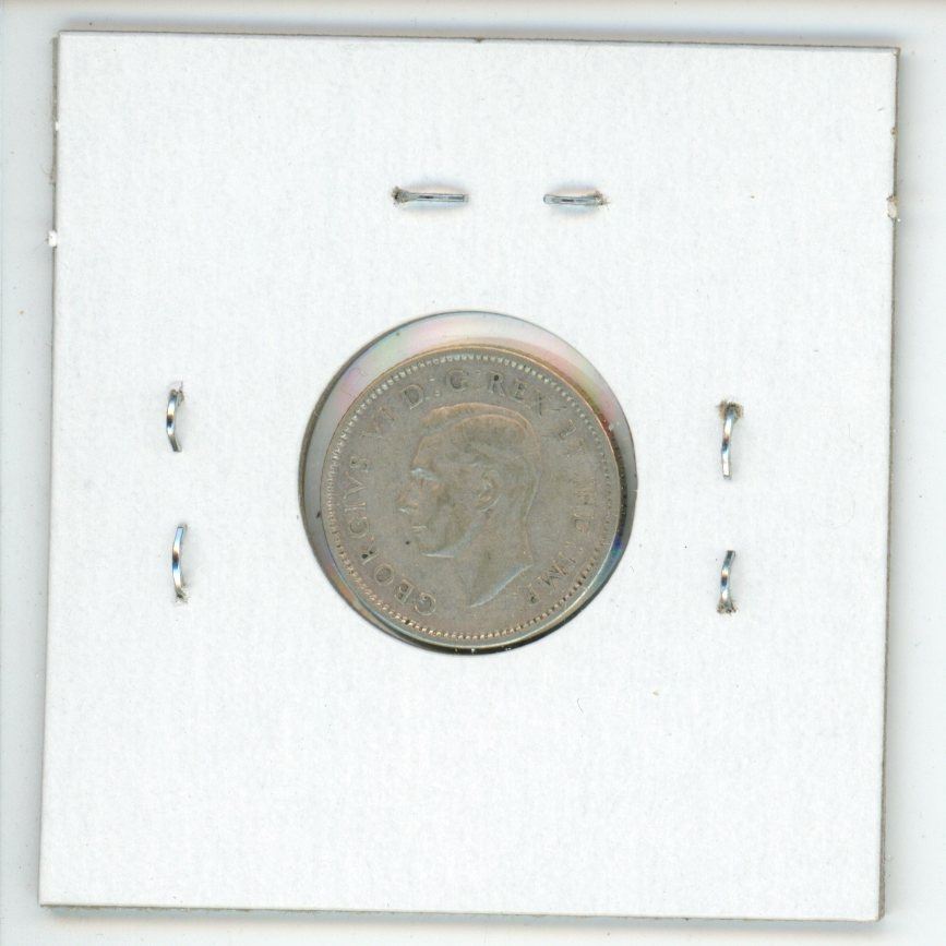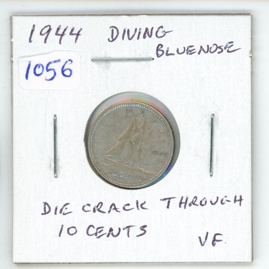 1944 Diving Bluenose Canadian Silver 10 Cents. Rotated Dies plus Die Crack through 10 CENTS. VF-20. Scarce.