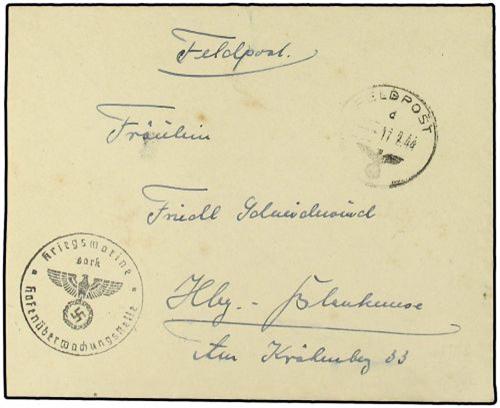1944 Envelope to GERMANY written from the German Occupation of Sark cancelled by FELDPOST datestamp with KRIEGSMARINE SARK/HAFENUBERWACHUNGSTELLE military cachet. Very rare item occupation mail.