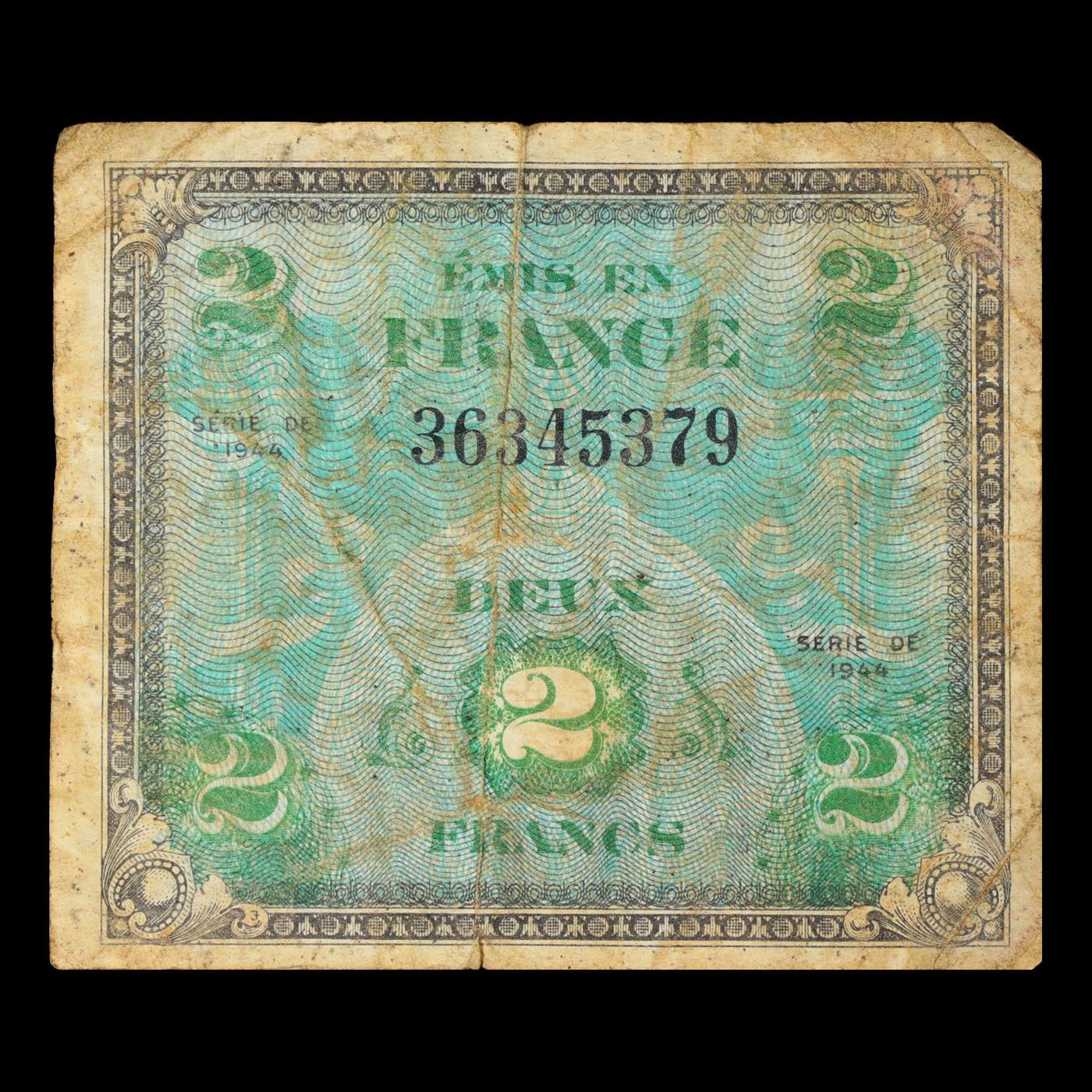 1944 France 2 Franc Allied Liberation Note P# 114A Grades vf+. The AM-Franc, or "flag ticket" franc, was a currency issued by the United States for use in Allied-occupied France in the wake of the Battle of Normandy. With the swift take-over of sovereignty by General Charles de Gaulle, who considered the US occupation franc as “counterfeit money”, the currency rapidly faded out of use in favour of the pre-war French franc.