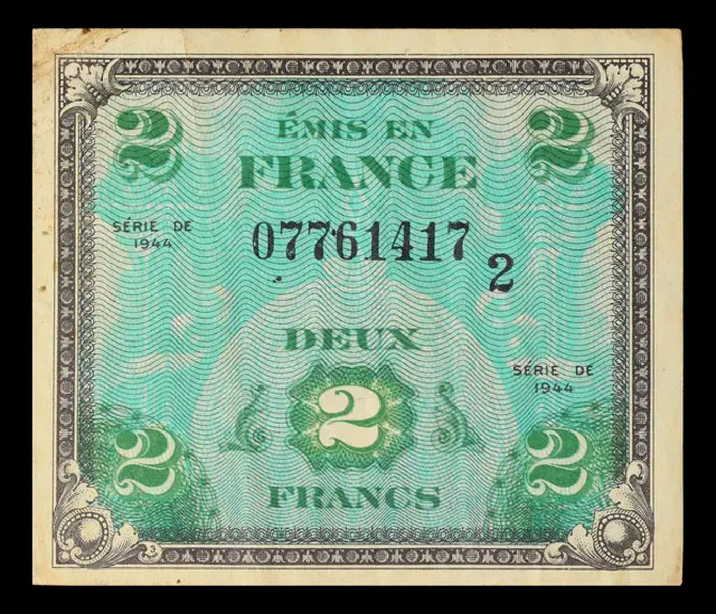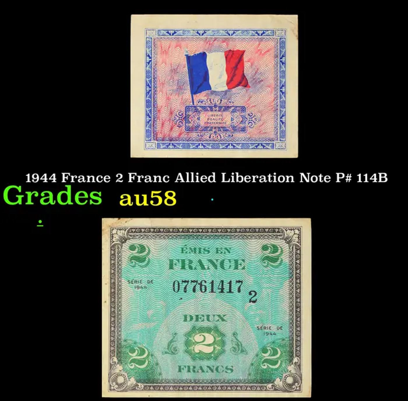1944 France 2 Franc Allied Liberation Note P# 114B Grades Choice AU/BU Slider. The AM-Franc, or "flag ticket" franc, was a currency issued by the United States for use in Allied-occupied France in the wake of the Battle of Normandy. With the swift take-over of sovereignty by General Charles de Gaulle, who considered the US occupation franc as “counterfeit money”, the currency rapidly faded out of use in favour of the pre-war French franc.