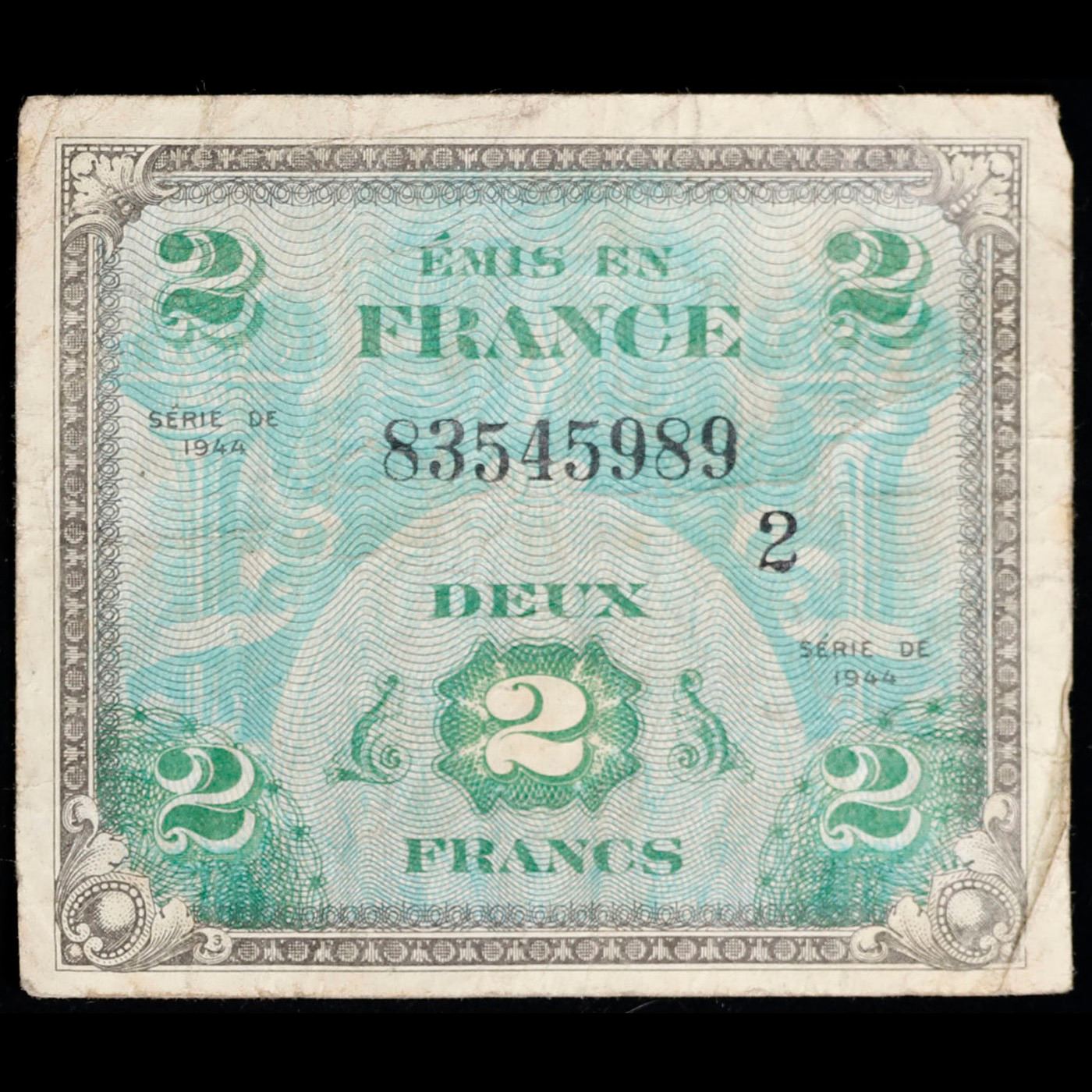 1944 France 2 Franc Note (WW2 Allied Currency) P# 114B Grades vf+.