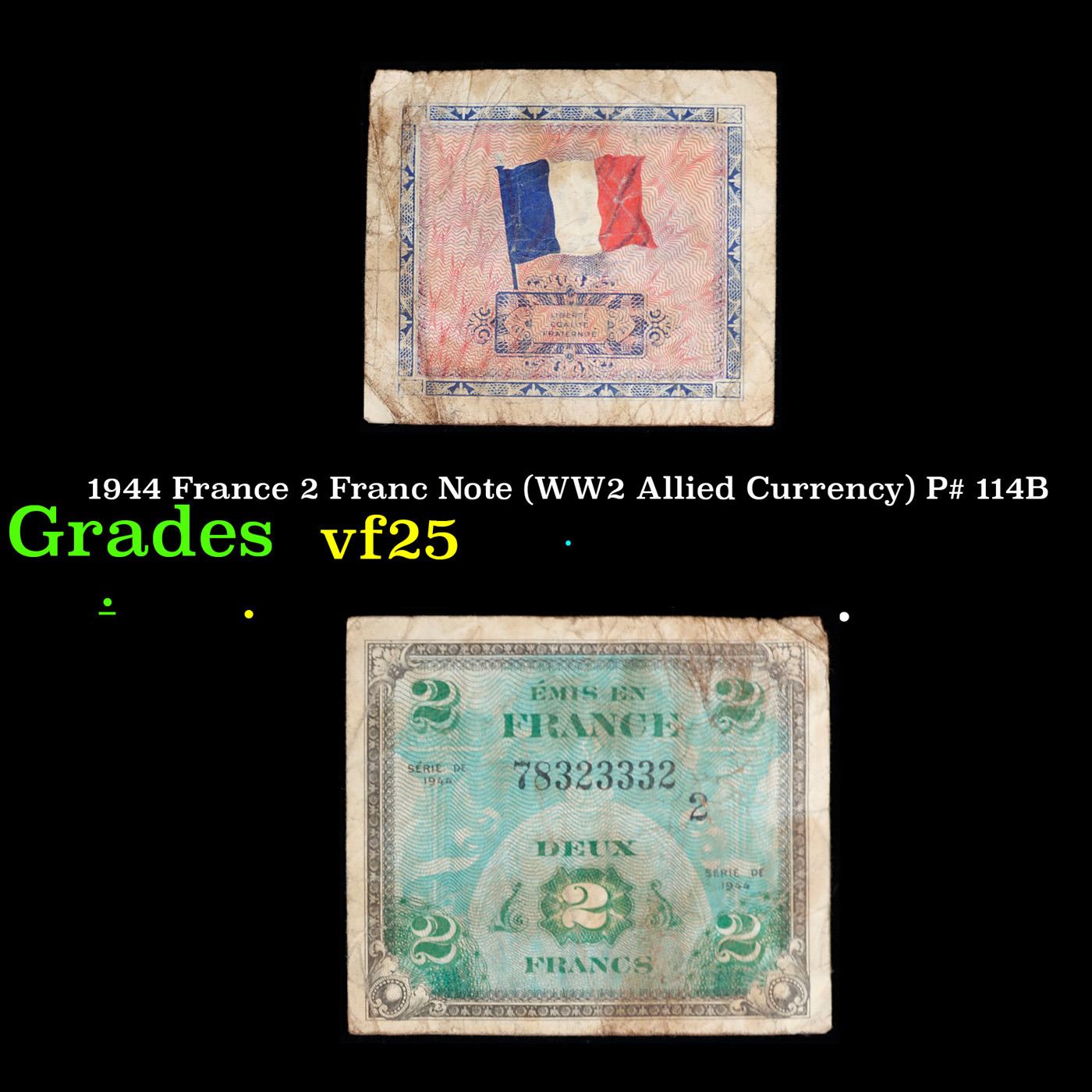 1944 France 2 Franc Note (WW2 Allied Currency) P# 114B Grades vf+.