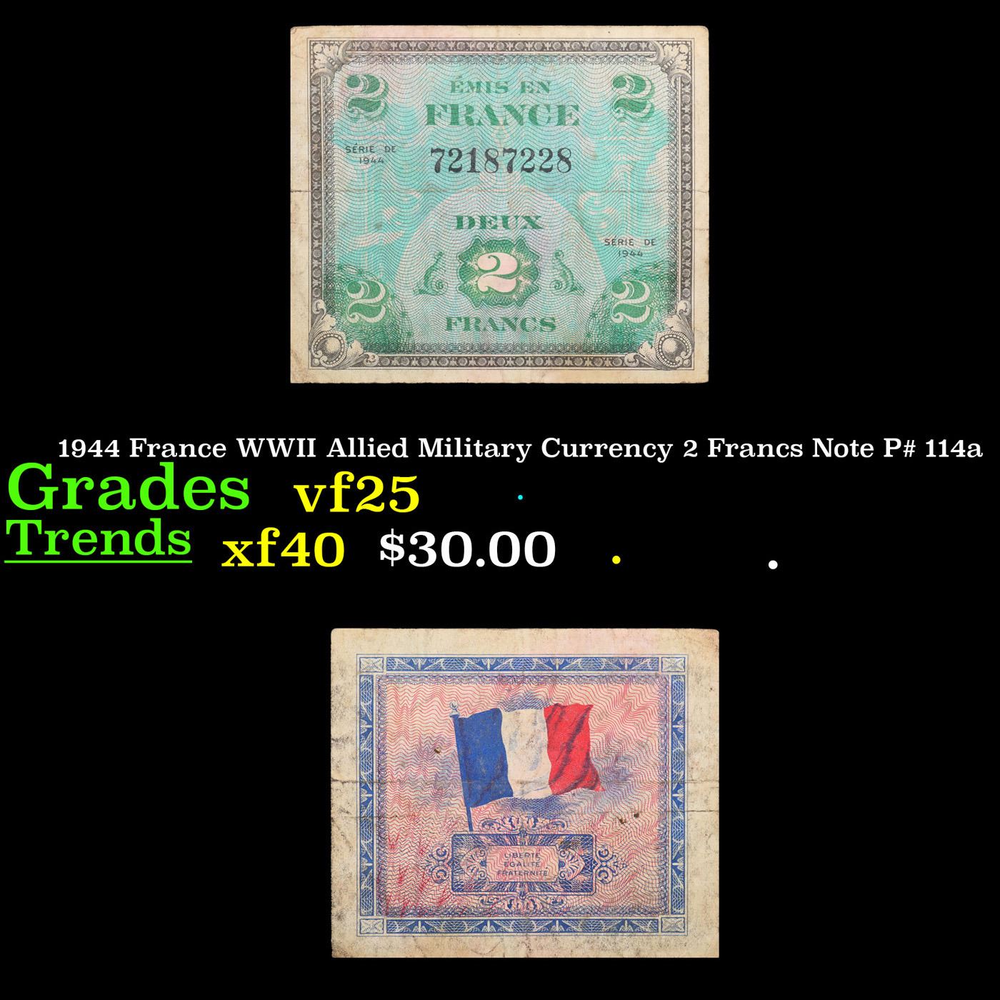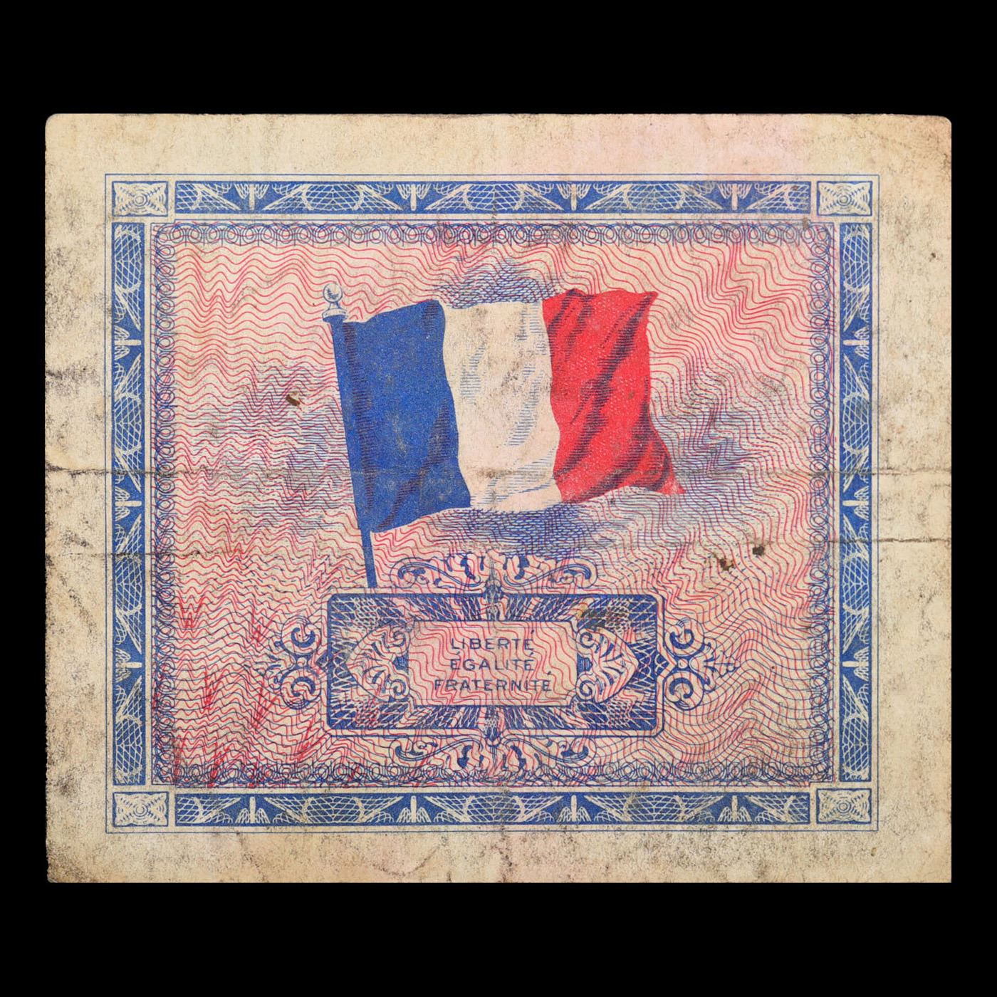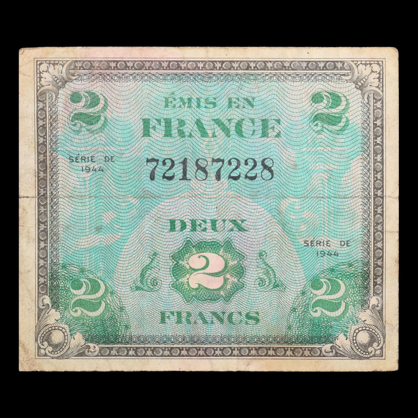 1944 France WWII Allied Military Currency 2 Francs Note P# 114a Grades vf+. The AM-Franc, or "flag ticket" franc, was a currency issued by the United States for use in Allied-occupied France in the wake of the Battle of Normandy. With the swift take-over of sovereignty by General Charles de Gaulle, who considered the US occupation franc as “counterfeit money”, the currency rapidly faded out of use in favour of the pre-war French franc.