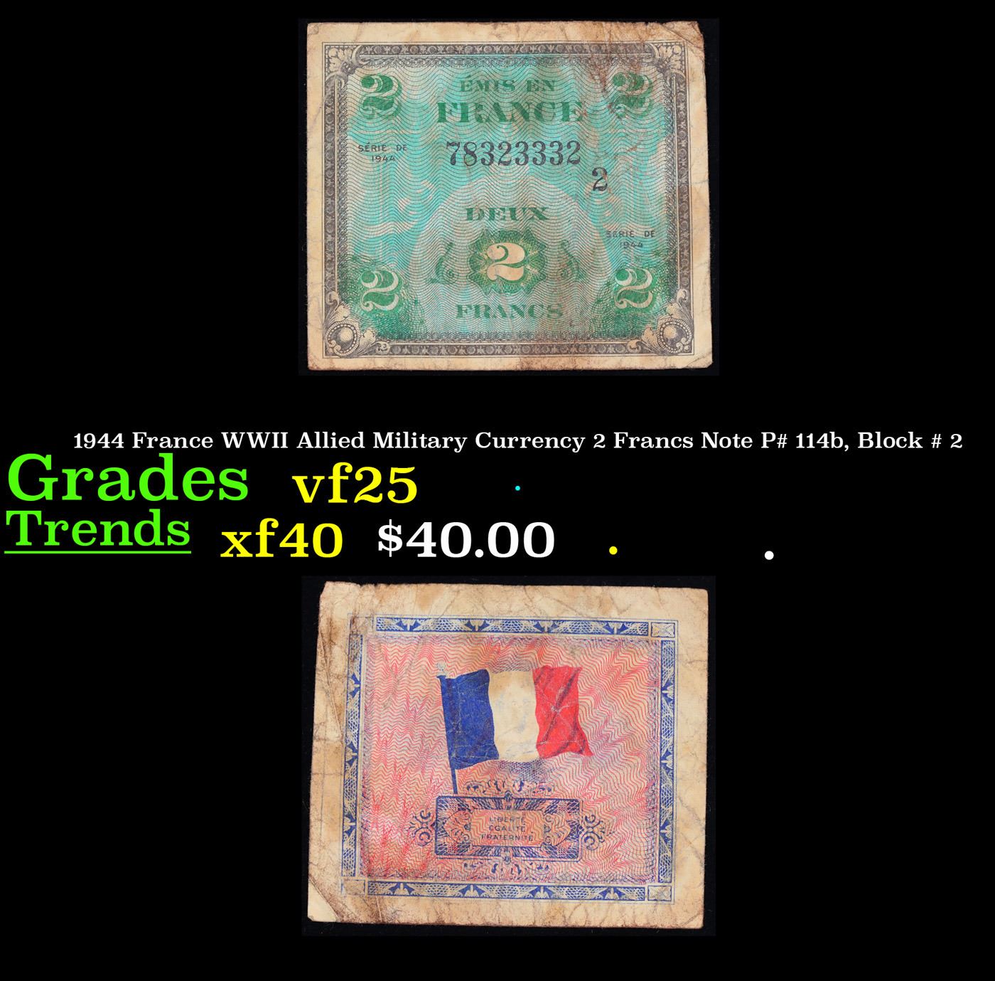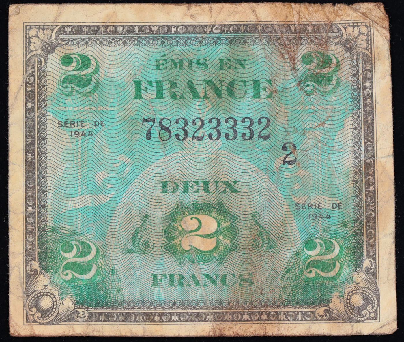 1944 France WWII Allied Military Currency 2 Francs Note P# 114b, Block # 2 Grades vf+. The AM-Franc, or "flag ticket" franc, was a currency issued by the United States for use in Allied-occupied France in the wake of the Battle of Normandy. With the swift take-over of sovereignty by General Charles de Gaulle, who considered the US occupation franc as “counterfeit money”, the currency rapidly faded out of use in favour of the pre-war French franc.