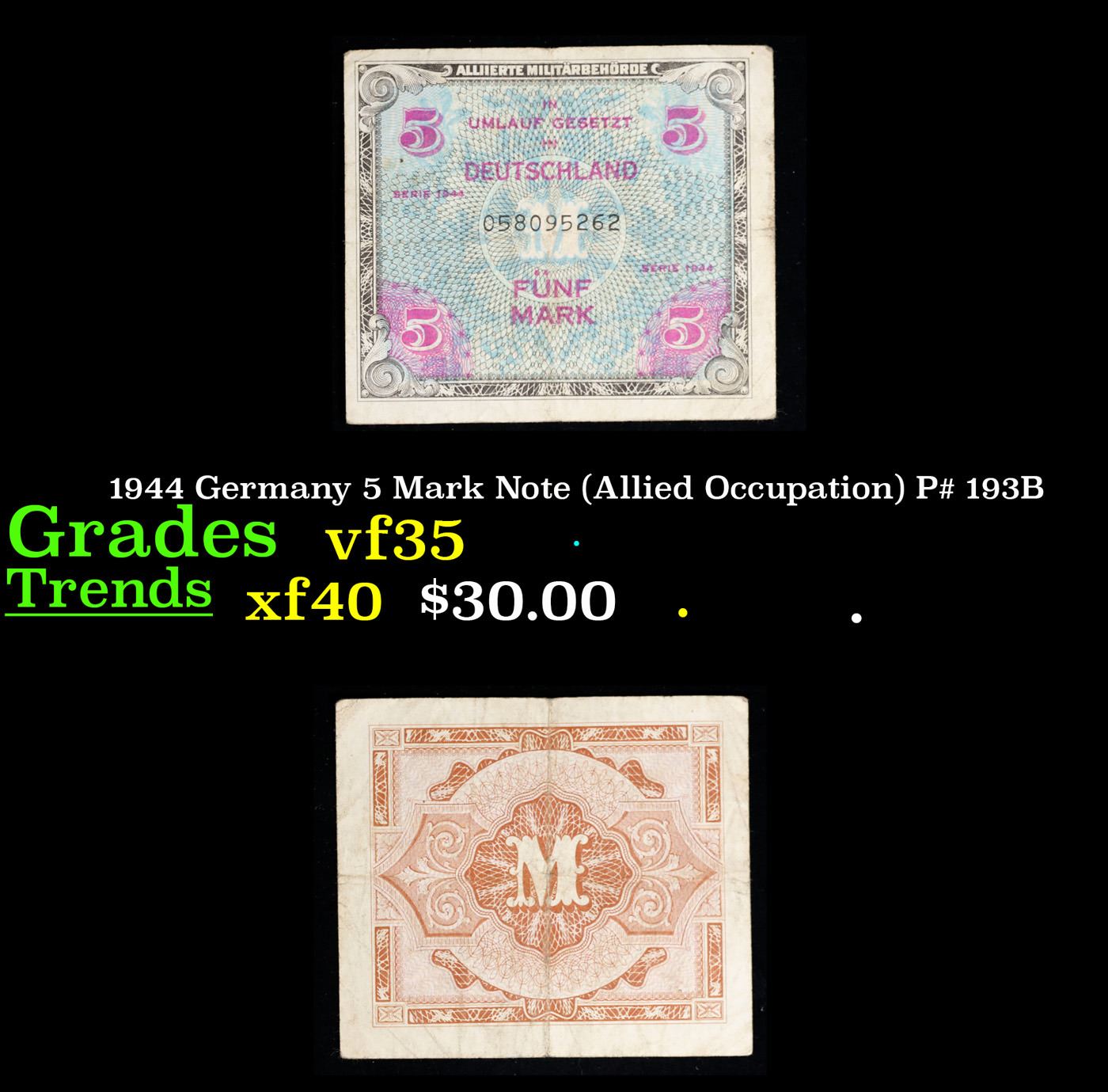 1944 Germany 5 Mark Note (Allied Occupation) P# 193B Grades vf++.