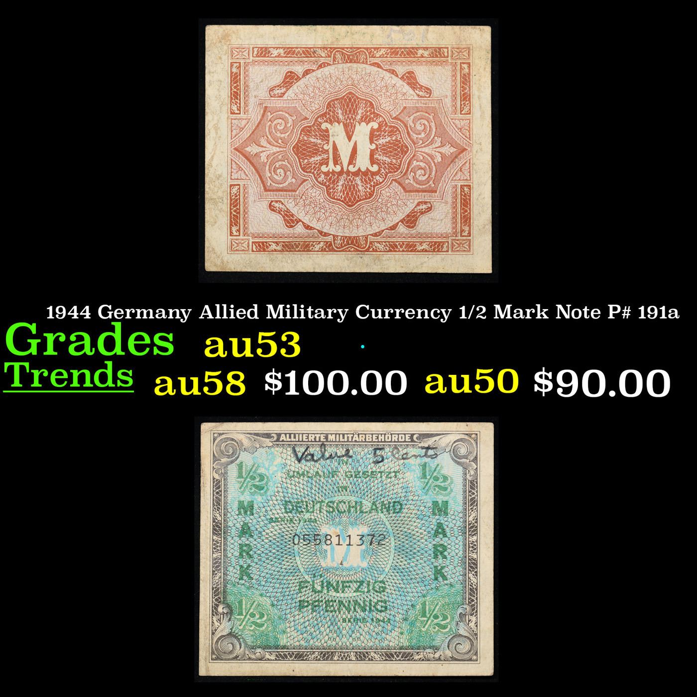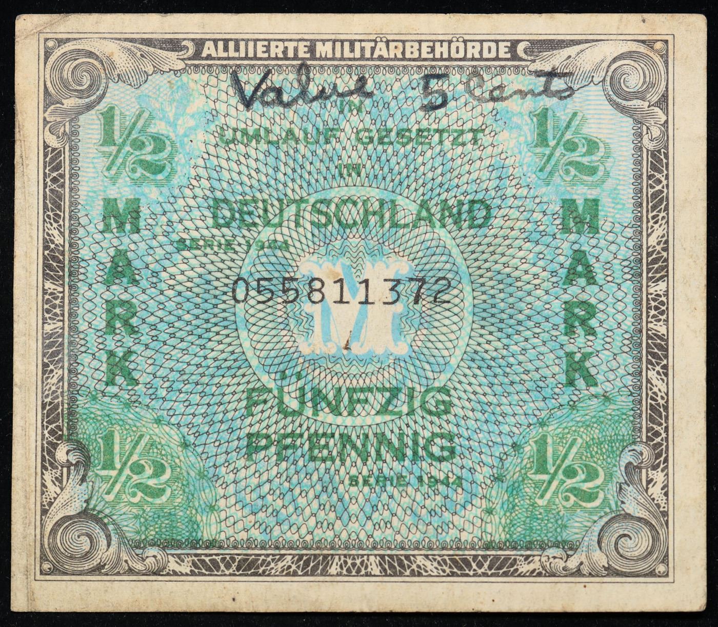 1944 Germany Allied Military Currency 1/2 Mark Note P# 191a Grades Select AU. The AM-Mark ("Allied Military Currency") was the currency issued in Allied-occupied Germany by AMGOT after the commencement of Operation Wild Dog in 1944. There were individual prefix identifications for Occupation zones (USA > 1, British > 0, French > 00, Russian > -). These notes circulated through mid 1948. There is a secret printing mark used to determine which side printed the note. For the Americans this is a stylized "F" for the printer, Forbes Lithographic, which appears on the 1/2, 1, 5 and 10 mark notes in the left ball of the scroll directly below the lower right denomination value. The letter also appears on the 20, 50, 100 and 1000 marks. The Soviet Union printed identical notes but without the "F".