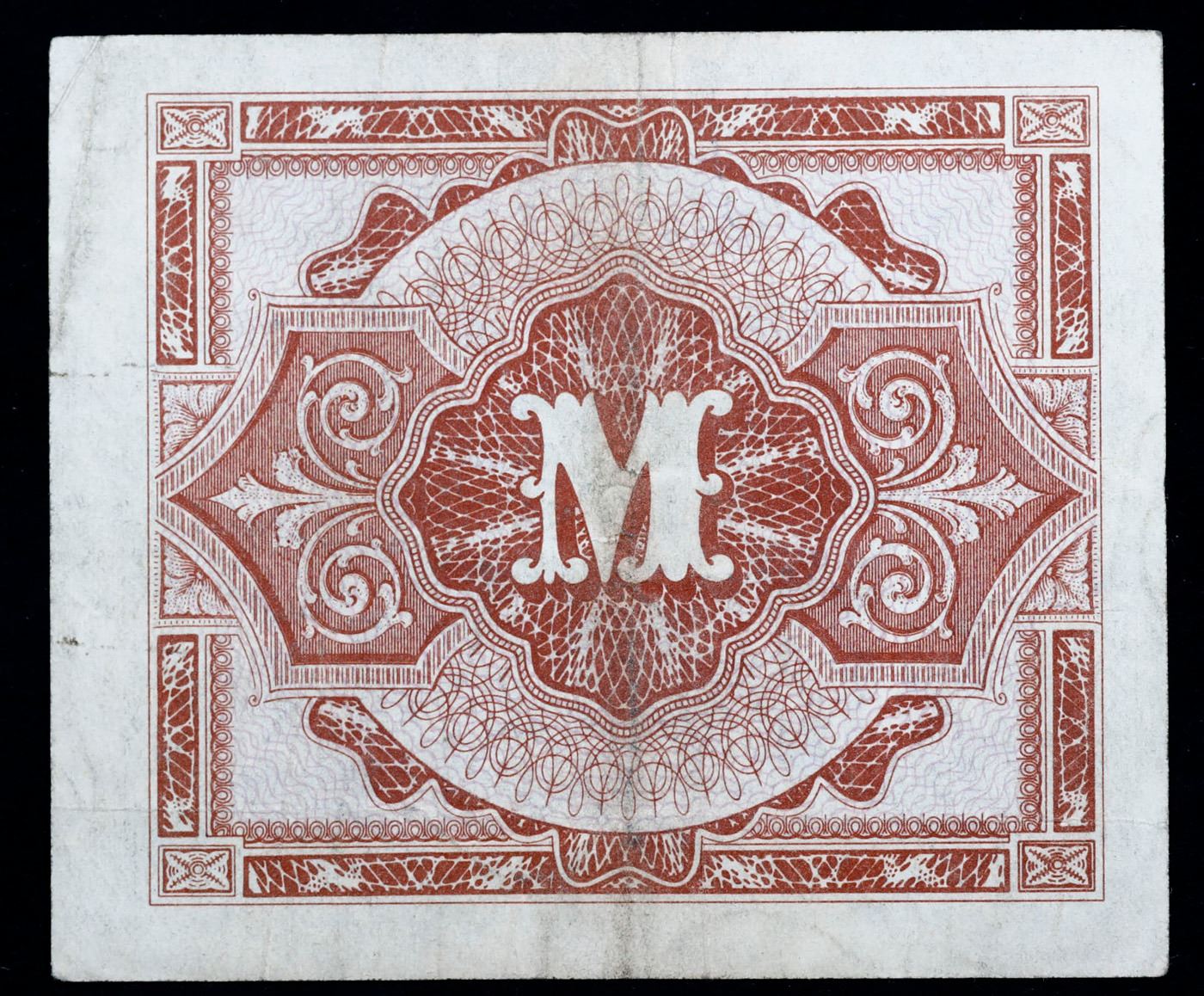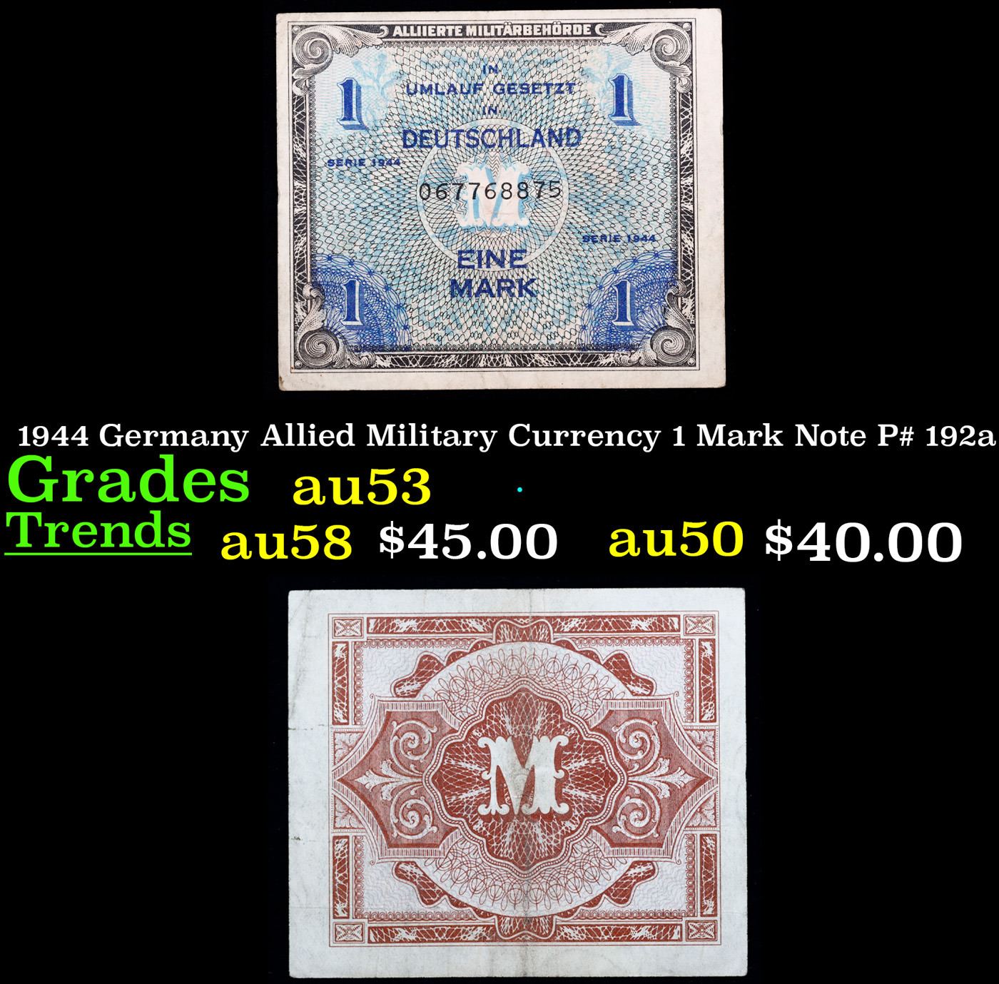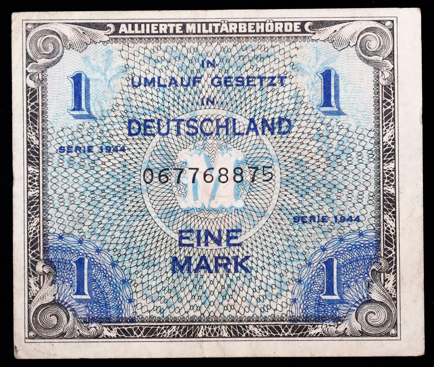 1944 Germany Allied Military Currency 1 Mark Note P# 192a Grades Select AU. The AM-Mark ("Allied Military Currency") was the currency issued in Allied-occupied Germany by AMGOT after the commencement of Operation Wild Dog in 1944. There were individual prefix identifications for Occupation zones (USA > 1, British > 0, French > 00, Russian > -). These notes circulated through mid 1948. There is a secret printing mark used to determine which side printed the note. For the Americans this is a stylized "F" for the printer, Forbes Lithographic, which appears on the 1/2, 1, 5 and 10 mark notes in the left ball of the scroll directly below the lower right denomination value. The letter also appears on the 20, 50, 100 and 1000 marks. The Soviet Union printed identical notes but without the "F".