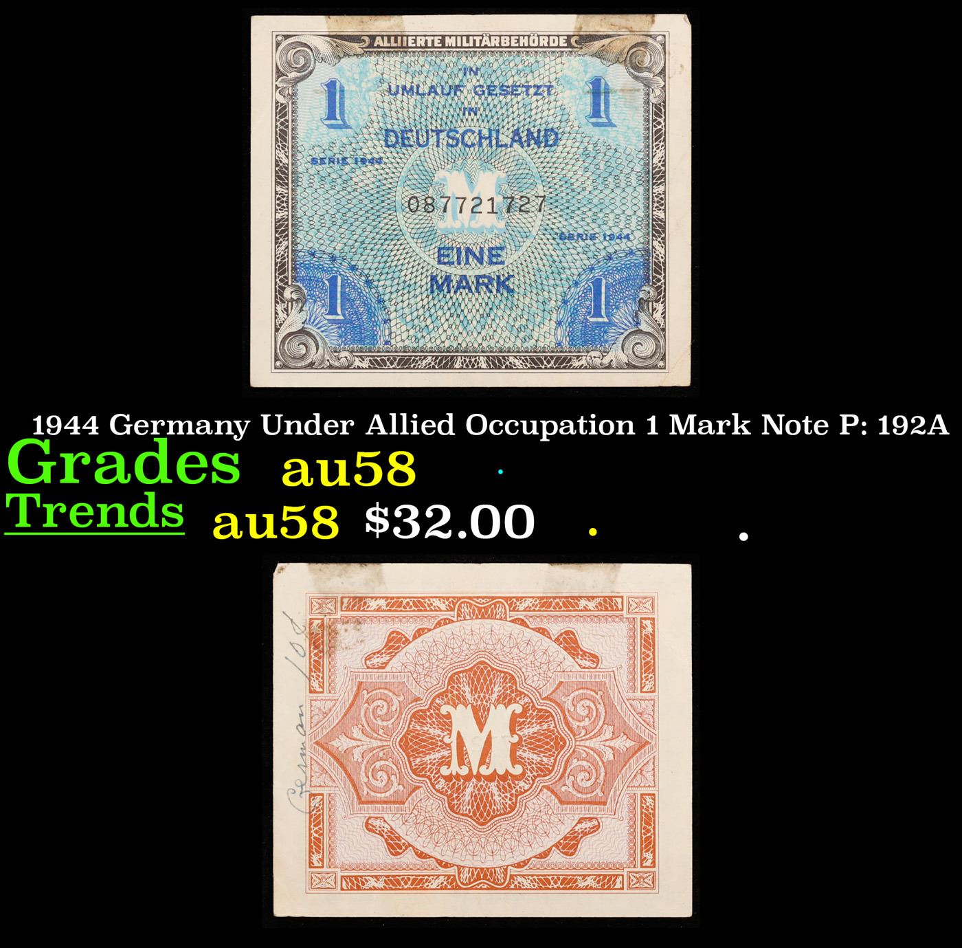 1944 Germany Under Allied Occupation 1 Mark Note P: 192A Grades Choice AU/BU Slider. The AM-Mark ("Allied Military Currency") was the currency issued in Allied-occupied Germany by AMGOT after the commencement of Operation Wild Dog in 1944. There were individual prefix identifications for Occupation zones (USA > 1, British > 0, French > 00, Russian > -). These notes circulated through mid 1948. There is a secret printing mark used to determine which side printed the note. For the Americans this is a stylized "F" for the printer, Forbes Lithographic, which appears on the 1/2, 1, 5 and 10 mark notes in the left ball of the scroll directly below the lower right denomination value. The letter also appears on the 20, 50, 100 and 1000 marks. The Soviet Union printed identical notes but without the "F".
